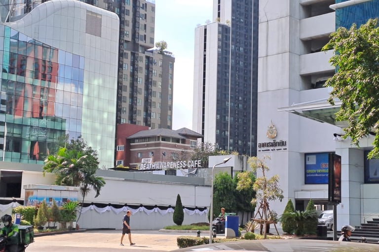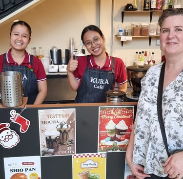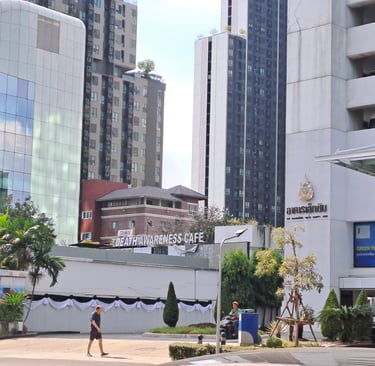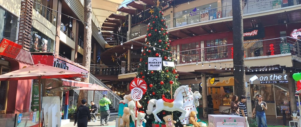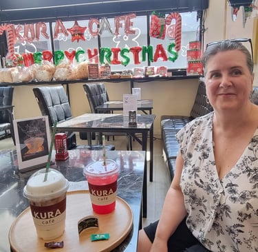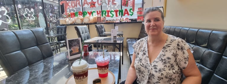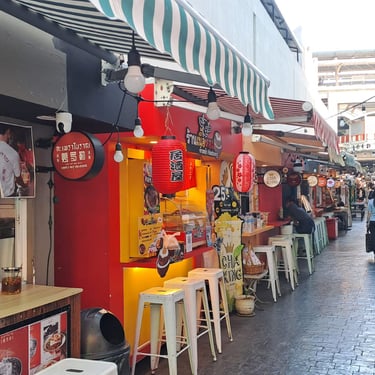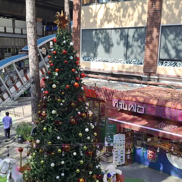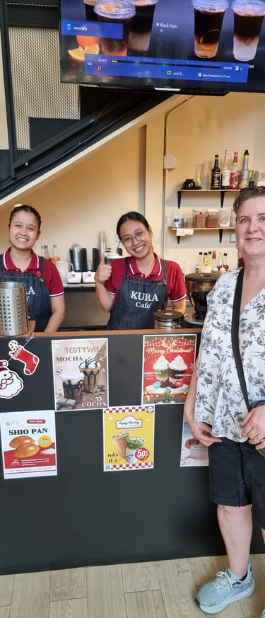 The area is littered with cute cafes, street vendors, restaurants and shops. We could see that there was a small mall across on the other side of the street, and had decided to explore one side before crossing over the bridge walkway and then doing the other side. We walked all around the area, and we really enjoyed it. There were a lot of lovely leafy streets with nice condos, fancy cars and the vibe was really cool. The weather was unfortunately very hot. After a bit of walking in the heat, we stumbled upon a little café that we had seen in a Ted Aroi (YouTuber) video called Kura Café and went in there for a little rest and a cool down. The girls serving us were so sweet and friendly, and because we had spent over 100 baht, we could pick a golden egg from a bucket. I picked the egg, and we won a free drinks voucher. As we were leaving, we told them that we visited because of the Ted Aroi video and showed it to them – they had no idea, and they were so happy to watch it. Definitely go here if you are in the area.