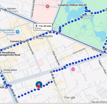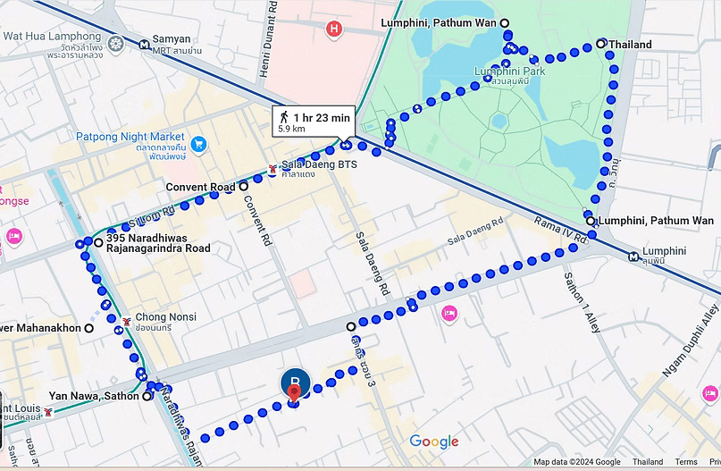 In addition, it is also connected to another public park, Benjakitti Park in Khlong Toei District, using a 1.3 km elevated pedestrian walkway and bicycle lane at the corner of Sarasin Intersection, where Witthayu Road cuts Sarasin Road.