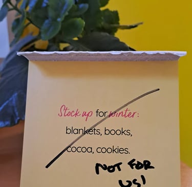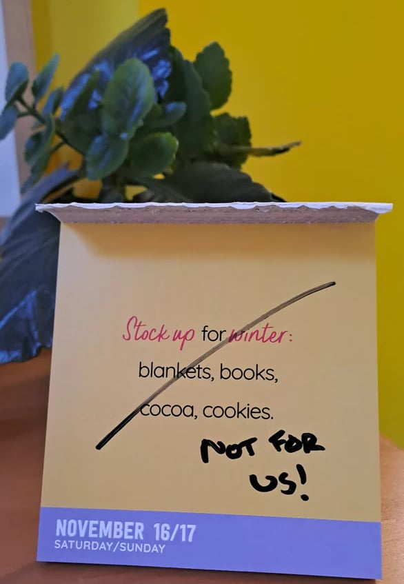 So I ripped off the sheet and my message was all about stocking up for winter and with a smugness scale of 10, I replied back (thankfully there was no-one else in the kitchen to hear me at the time) to the message with a "not for us sucker" and scored out the message accordingly.
