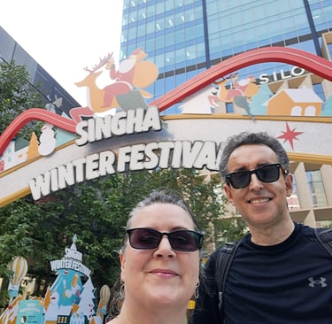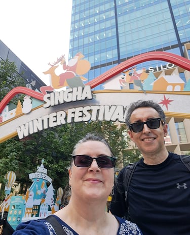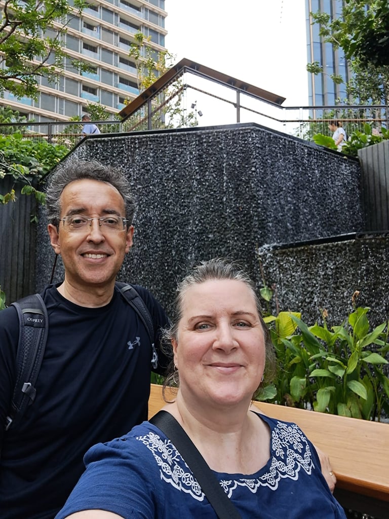 We have a little rest outside of the Silom Complex Mall – as we are not too tired, exhausted (or hungry) yet, we don’t quite need to get indoors to cool down, but it is just refreshing to take everything in that is going on around us. There is a fab little outdoor bar area here, which looks like it comes alive in the evening, as there is an area for musicians to play, and we have seen some similar type outdoor areas (also sponsored by the Thailand Singha beer/ale corporation) near the EM Sphere area. R takes a photo for a lovely Thai family, and it makes us smile just seeing this little family enjoying their day out together and grateful for his offer.