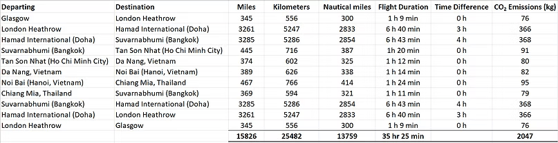 The biggest flight cost (£1640) was for the six main flights (Glasgow to London, London to Doha, and Doha to Bangkok), getting to Bangkok from Glasgow, and the return journey. The remaining £797 was for five flights: Bangkok to Ho Chi Minh City, Ho Chi Min City to Da Nang, Da Nang to Hanoi, Hanoi to Chiang Mai, and Chiang Mai to Bangkok.