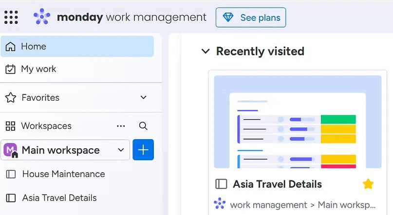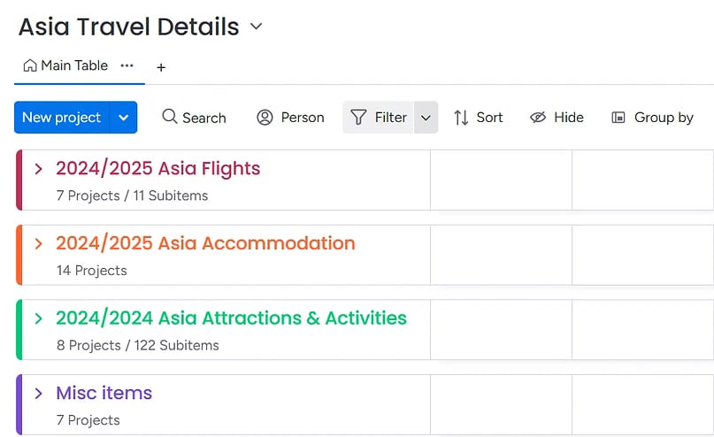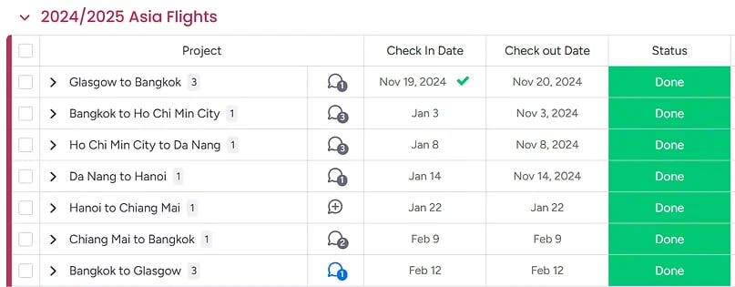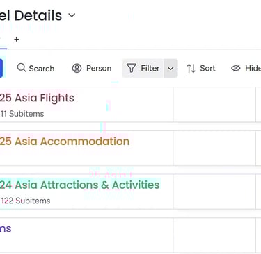 It is also probably useful at this point to mention another app that I used to keep things organised for us. That was an App called Monday.com, which you can access online or through the app on your phone. This was helpful for us as we were both able to access the information, and we could also update and add information and files before the trip started and during the trip as things changed. For example, we would add our electronic boarding pass files to this for the various flights we took. We had to change one accommodation when they cancelled our booking due to unexpected renovation works; we added our train tickets for Hua Hin here. This meant we didn't need to take loads of paperwork items with us. We just used the free version of this, which allows two collaborators, and this was fine for the two of us. For an idea of how we used it, see the images below: