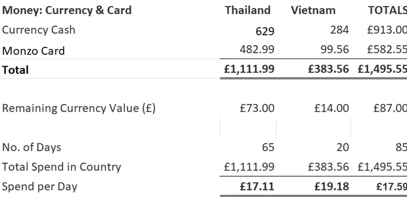 In terms of our daily costs when in Thailand and Vietnam, when comparing our currency and bank spending, we spent slightly less in Thailand (~£17/day) compared to Vietnam (~£19/day). As we had more time in Thailand, we did have some days where we didn't do very much, or we would eat in the apartments, which may explain the difference between daily spending.