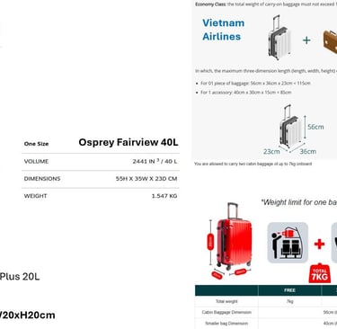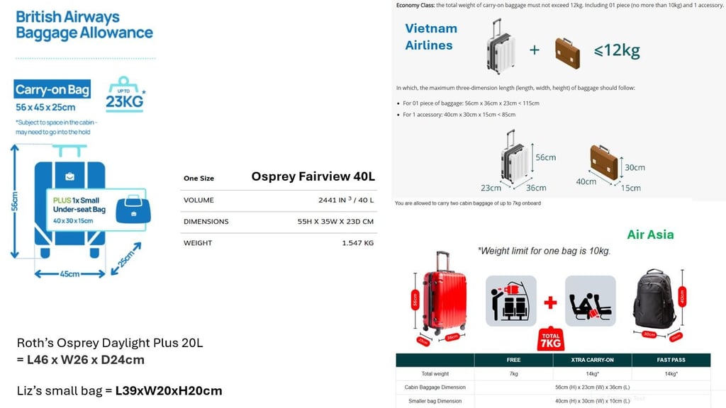 We used several airlines: British Airways, Qatar Airways, Vietnam Airlines, Air Asia and Bangkok Airways. Although our main booking was made through British Airways, which has a good cabin baggage allowance (one cabin bag and one personal bag), what we didn't realise was that for any connecting flights with their partner airlines, we would be restricted to the cabin baggage allowance for the partner airline if it was covering the longest part of the journey and for Qatar Airways, they only allow a measly one bag and a maximum of 7kg! We were fine going out for the flights, but coming back, we had to check both of our rucksacks in as checked baggage as they were both in the 11 to 12 kg weight range.