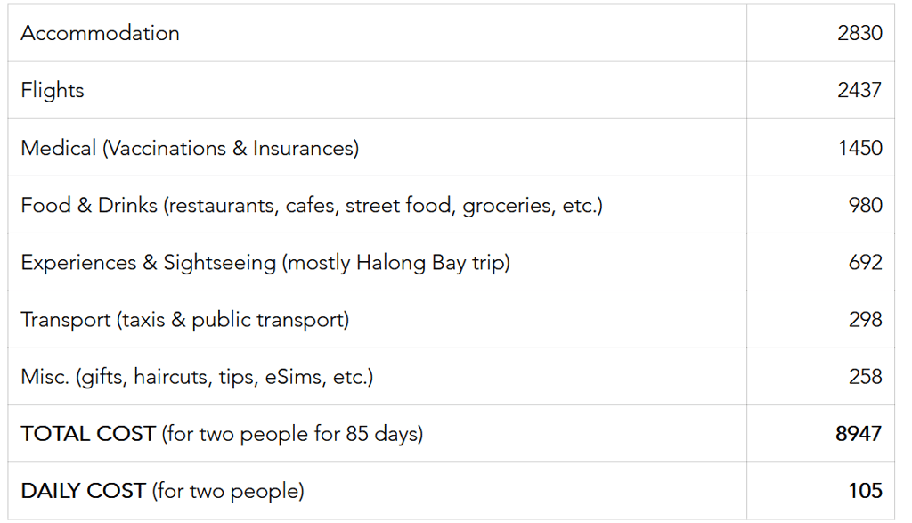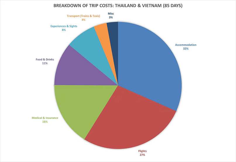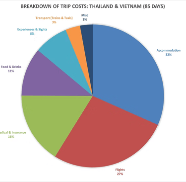 Our trip consisted of almost 3 months (85 days) and covered two countries, Thailand (63 days) and Vietnam (20 days), and two travel days (getting there and back). However, for ease of calculation, I've just lumped the travel days into the Thailand grouping.