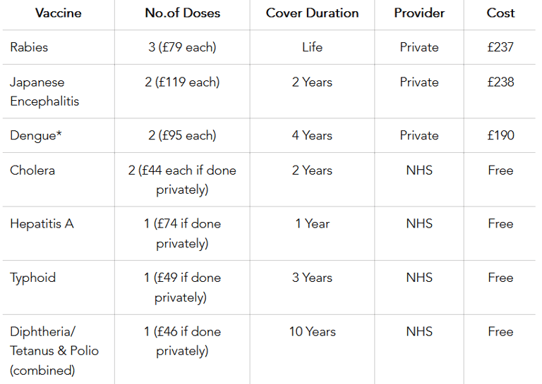 Note 1: The NHS does not provide a service for you to organise to pay for any additional vaccinations that you may need through them, so you need to find a Private Travel Clinic for these.