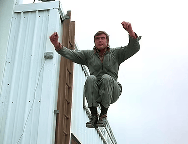 Steve Austin, a.k.a. Six Million Dollar Man, stepping up onto a pavement.