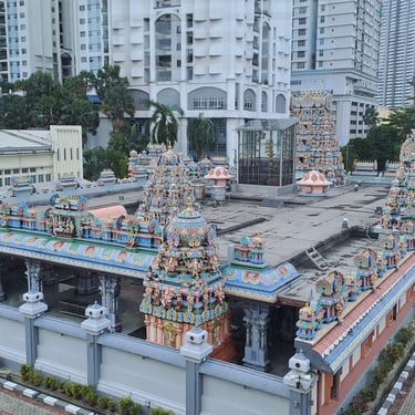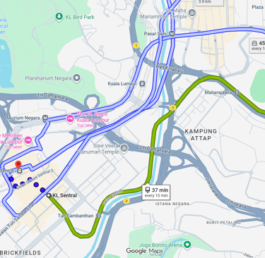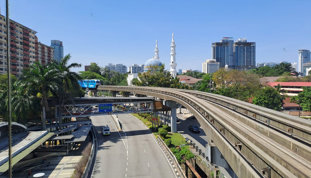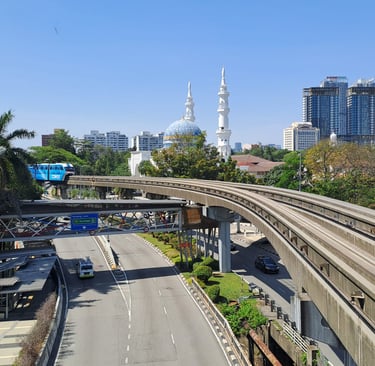 The monorail system was explicitly designed for the "Golden Triangle" area (Bukit Bintang, Imbi, Hang Tuah), often following the median of main roads. Due to the dense, built-up nature of the city, the elevated, precast concrete guideway was designed to snake around buildings, resulting in a very curvy, "snaky" route with sharp turns, particularly in the city centre. The minimum curve radius on the main line is 70 meters, which contributes to the sharp, winding, and sometimes "twisty" feel of the ride. While designed for a maximum of 80 km/h, the tight, complex, and curvy nature of the route, especially in the city centre, means the train operates at moderate speeds. The line is noted for its sharp turns and elevated, winding, and sometimes "snaky" route.