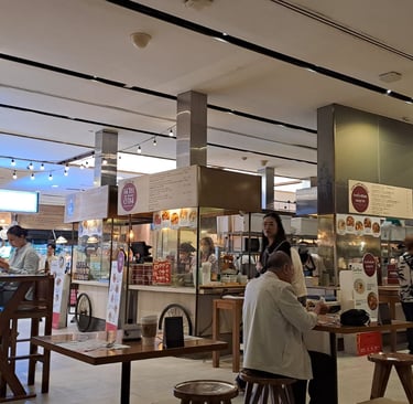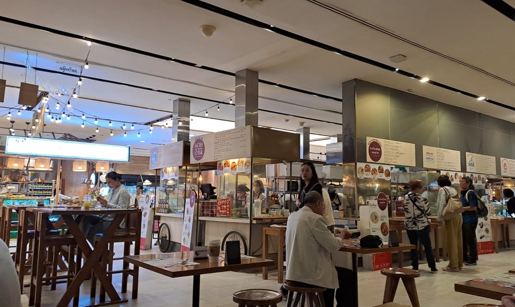 For lunch, we headed to the food hall on the lower ground floor. Even though this was a food hall, it was slightly different from most of the food halls we have experienced so far. On entry, you are given a card with a 1000-baht value on it, and you use this card to buy what you want. Then, when you are leaving, you hand over your card, and the cashier then rings up the cost, and you can pay either in cash or by card. There is an additional 5% added onto the bill, which I guess is to help offset the increased costs associated with operating the food hall. It was certainly worth it as the overall feel is more upmarket. For example, you don’t have cutlery stations, but all the tables are laid out with paper table mats and cutlery for you, and you don’t return your tray to a tray station as the staff are on hand to take the plates, clean the tables and set up new table areas. You can also even pay a little additional charge to get your food brought to your table.