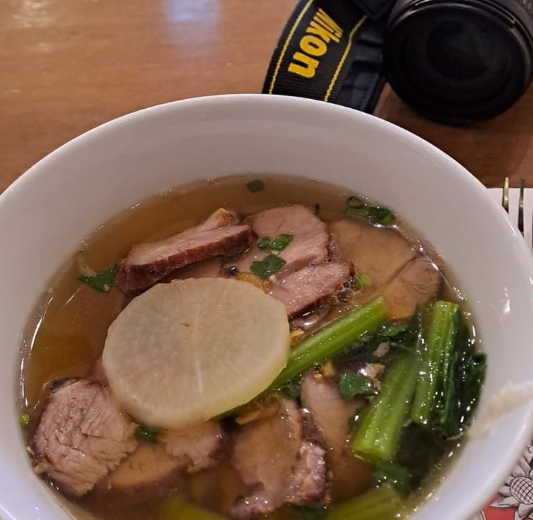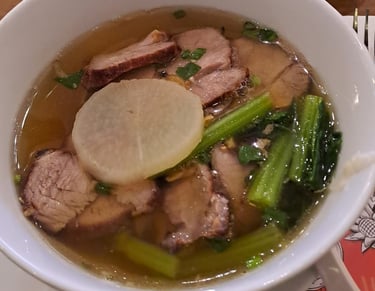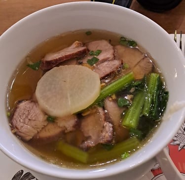I had a pork and wanton soup dish, and R had a garlic chicken and rice dish. My choice was fantastic, but R’s was a little underwhelming in terms of flavour – possibly because he didn’t add any additional condiments or chilli? For afters, we had some banana dessert with mung bean and taro, which was fine but not really the sort of dessert we usually go for.