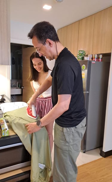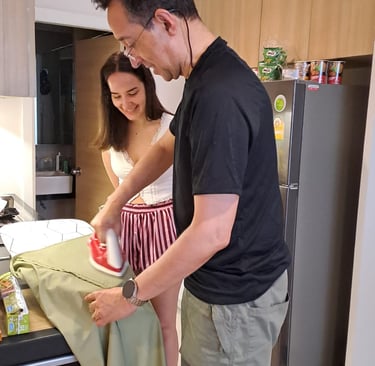 Of course, this also explains why they both S and Ms R have the biggest suitcases with them – so far we have noted 9 pairs of shoes between them and don’t get me started on the number of outfits, toiletries and beauty accessories. A funny wee point to note here was that when we arrived at the apartment, we didn’t realise that their bedroom doesn’t have a mirror in it, and we would have swapped but I really like the balcony and ensuite we have (and it’s more practical for us), but I said they could use our room anytime we are not using it, so the vanity area has now been taken over with hairdryer, tongs, etc. – oh it makes me laugh. Also note how our daughter has her father wrapped around her little finger, and he is ironing her skirt – I don’t think R has ever ironed any items of mine in the past!